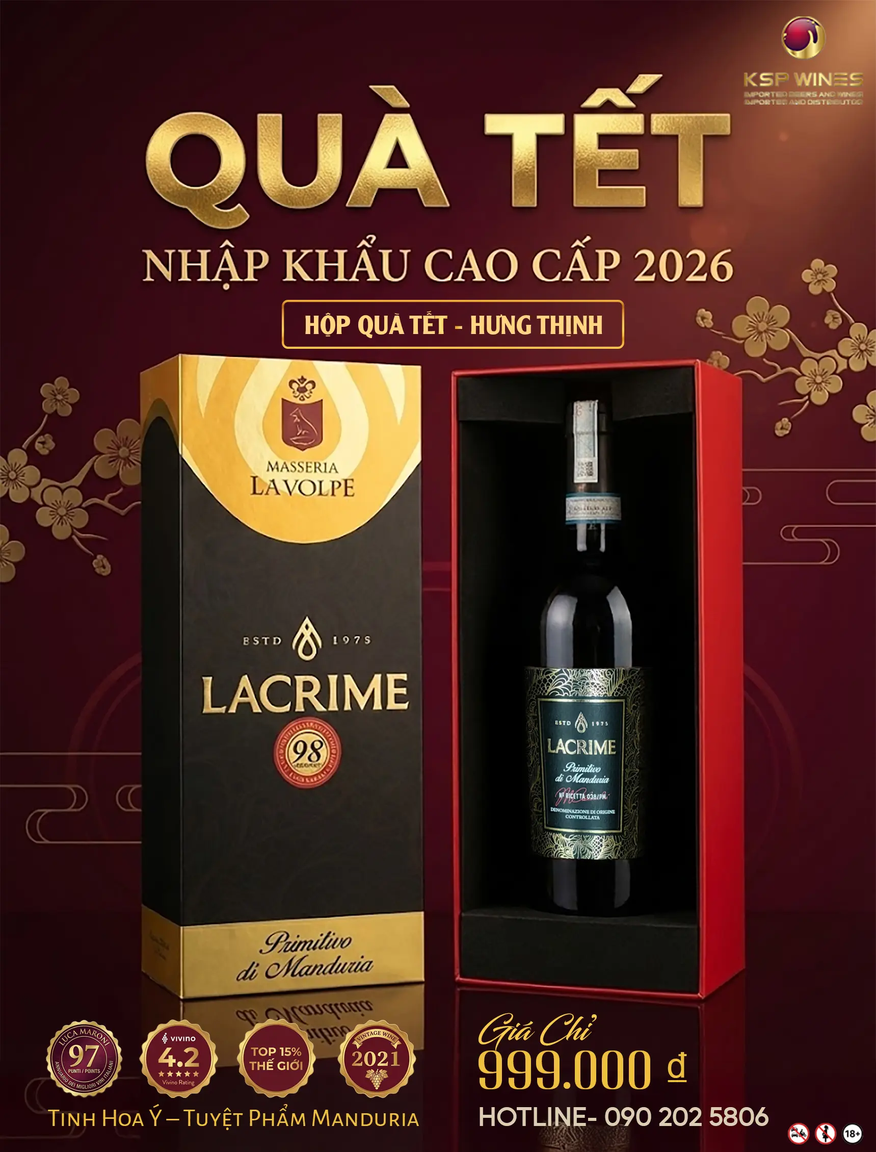 Set quà nổi bật với 01 chai vang đỏ cao cấp Lacrime Primitivo di Manduria DOC niên vụ 2021, nhập khẩu từ Ý, được đặt trong hộp quà sang trọng, chắc chắn, thích hợp biếu tặng và trưng bày trong không gian Tết.